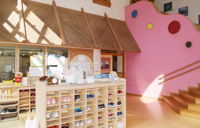 吹き抜けとなっているエントランスは、明るい陽が差し込み園舎を温かく照らしてくれます。
