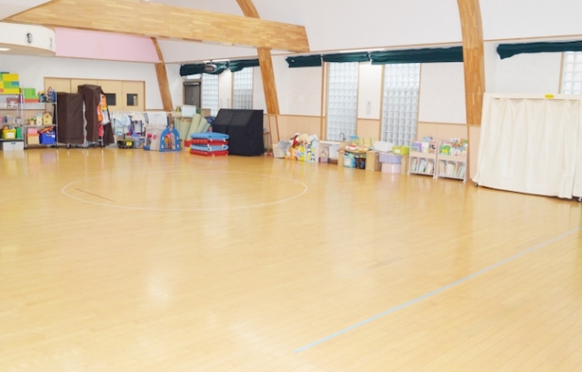 広々としたホールでは、季節の行事をはじめ、運動遊びをする等、多目的な活用をしております。早朝・夕方は、ホールにて異年齢保育を行っております。