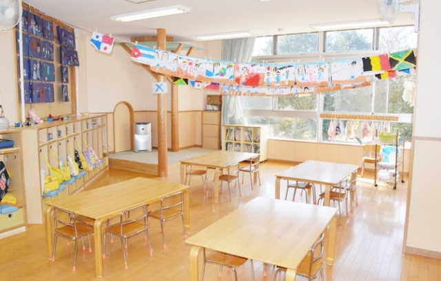 木を基調としており、温かい雰囲気に包まれています。部屋の奥には一段高くなっているスペースがあり、絵本を見たり、トランプやかるた遊び等座ってのんびりと遊べるところも、子ども達にとっては人気です。